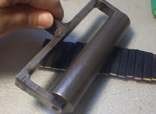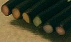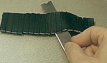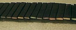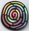 Step One: Start out with six Skinner logs (for a lesson on how to do a skinner blend go to Polymer Clay Central ). The logs I used here are about 1/2" wide by 3" long. I used pastel colors, but any colors could be used. I think a cane done in monocromatic would be georgous. Wrap a thin sheet of black clay around all the logs. I used a #6 (on the Atlas machine -- very thin) for this cane. Using a #7 or #8 also has a nice effect. After they are wrapped, reduce each log until they are about 1/4" wide. Step Two: Run each log, lengthwise, through your pasta machine at the thickest setting.