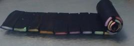 Step Three: Take another sheet of black clay and roll it on a #6 (Atlas machine) setting. Cut it so it is 1 1/2" wide. For the length, just make sure it's long enough to lay all the Skinner slices on, about 12" long. Next, cut your Skinner logs/strips (or what you sent through your pasta machine) into 1 1/2" pieces. Place the in a pleasing order along you sheet of black clay. I used red, orange, yellow, green, blue and purple.