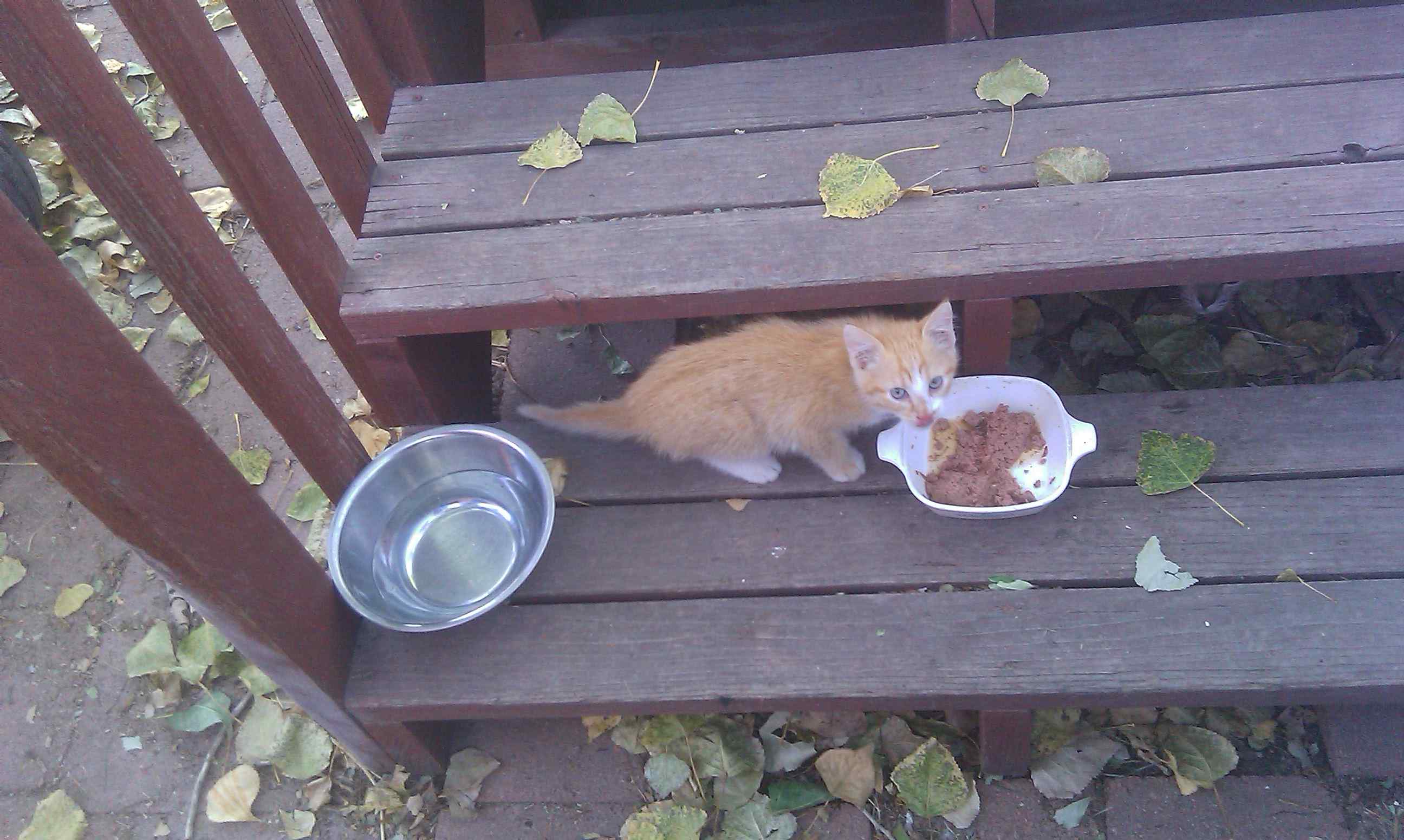 New Litter Found. Just opening their eyes, new kitties, one white and one yellow, emerge from under our trailer. Two new kitties came out just after we moved in about four months ago. We gotta end this somehow. Meanwhile, they are cute . . .
