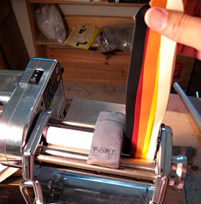 | 3. | Set the pasta machine dial on the widest gap setting (#1 on Atlas). Roll the 'carrots' through the pasta machine. Fold the strip in half, slightly pinch the folded edge to narrow it and feed the folded strip (folded edge first) into the pasta machine again. Repeat the fold-pinch-feed steps until you have a smooth blend: about 20-30 reps. |
